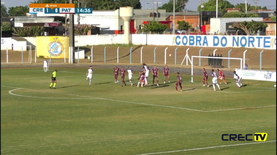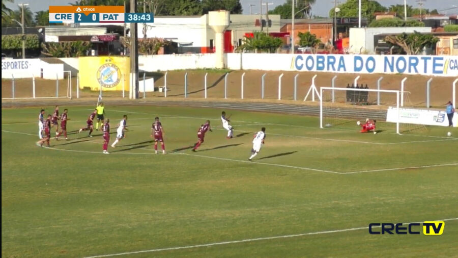 O Patrocinense tentou reagir, buscando levar perigo ao ataque, mas a defesa do CREC estava bem postada. Aos 40 minutos do primeiro tempo, em uma jogada rápida, o meio-campista Guilherme Carrijo interceptou a bola no meio de campo e lançou um contra-ataque. O goleiro do Patrocinense acabou cometendo um pênalti ao tentar parar o centroavante do CREC. Na cobrança, o atacante Felipe Salles chutou fraco, permitindo a defesa do goleiro, mas Diego Lopez , atento ao rebote, cabeceou para o fundo das redes, encerrando o primeiro tempo com 3 a 0 no placar.