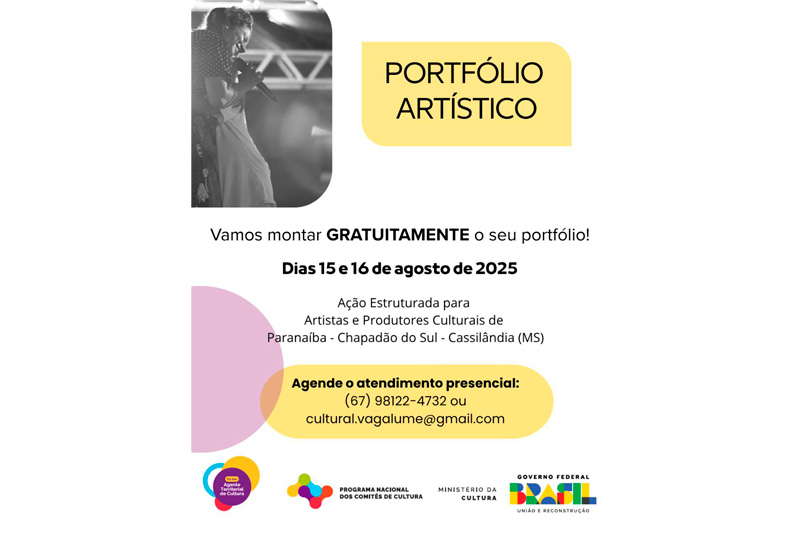 Nos dias 15 e 16 de agosto, sexta e sábado, vai acontecer o atendimento gratuito de elaboração de Portfólio Artístico para artistas e produtores culturais de Chapadão do Sul, Cassilândia e Paranaíba (MS).