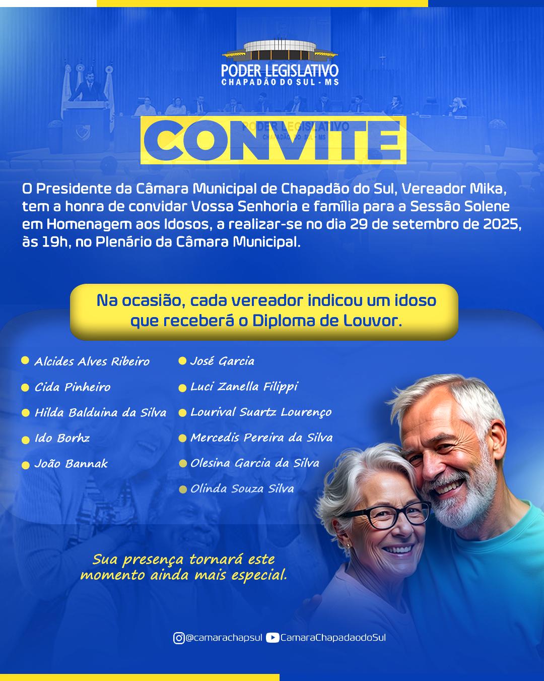 A Câmara Municipal de Chapadão do Sul realiza nesta segunda-feira, às 19 horas, uma sessão solene em comemoração ao Dia Internacional do Idoso.
