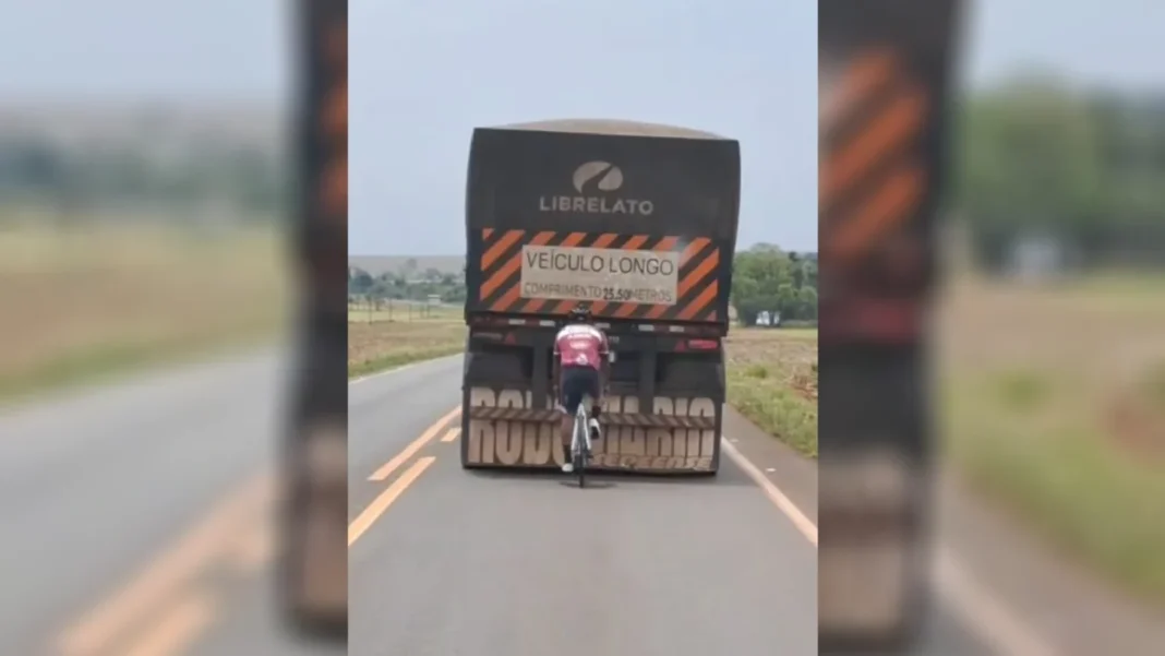 Ciclista foi flagrado “pegando vácuo” atrás de um caminhão, na MS-157, nesta quinta-feira (2). Conforme o registro, o homem seguia de Maracaju com destino a Campo Grande.