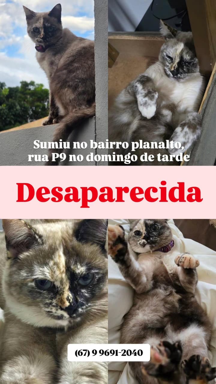 Desapareceu neste domingo, em Chapadão do Sul, essa gatinha de estimação (ver fotos).