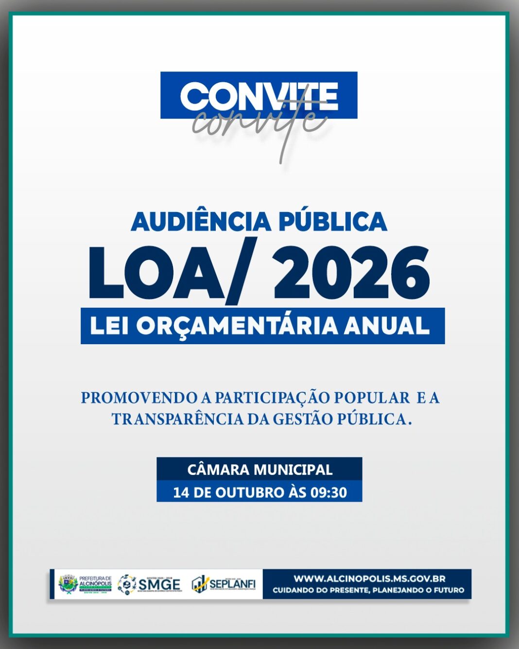 A Prefeitura de Alcinópolis, por meio da Secretaria de Governo e Gestão Estratégica e da Secretaria de Planejamento, Administração e Finanças, convida toda a população e as entidades representativas da sociedade civil organizada para participar da Audiência Pública da LOA 2026 – Lei Orçamentária Anual.