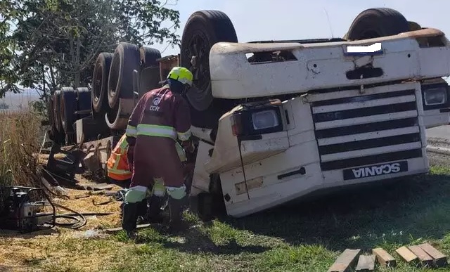 A imagem mostra um caminhão Scania virado de rodas para cima, no gramado ao lado da rodovia. Um socorrista com capacete e uniforme de resgate, com a marca da CCR nas costas, trabalha junto à cabine totalmente amassada. No chão, há ferramentas, um cilindro e equipamentos de salvamento, enquanto grãos de milho aparecem espalhados perto do acostamento.