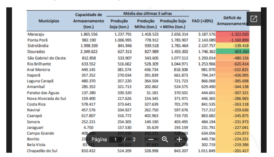 Com base em dados da Conab (Companhia Nacional de Abastecimento) e do SIGA/MS (Sistema de Informação Geográfica do Agronegócio), o estudo mostra que o Estado produz, em média, 22,9 milhões de toneladas de soja e milho por safra, mas possui estrutura para armazenar apenas 16,4 milhões de toneladas. Como o estudo foi feito com estimativas, o impacto pode ser ainda maior, já que o IBGE apontou que as safras deste ano podem somar 25,45 milhões de toneladas.