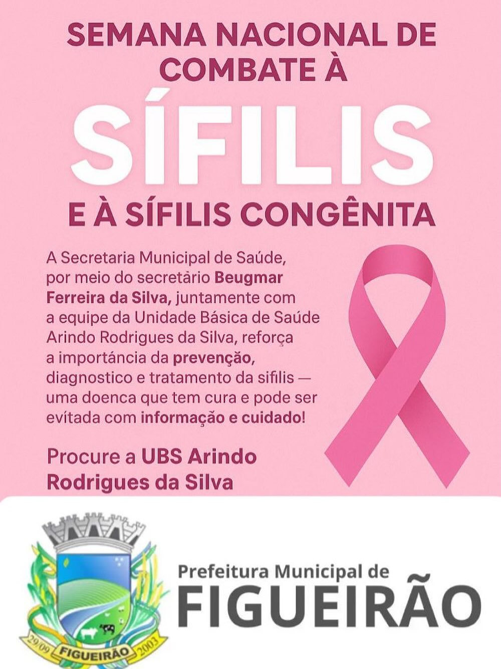 A Prefeitura Municipal de Figueirão, por meio da Secretaria Municipal de Saúde, e sob a coordenação do secretário Beugmar Ferreira da Silva, juntamente com a equipe da Unidade Básica de Saúde Arindo Rodrigues da Silva, dirigida por Fabrícia Daniela Fagundes, reforça a importância da prevenção, diagnóstico e tratamento da sífilis — uma doença que tem cura e pode ser evitada com informação e cuidado!