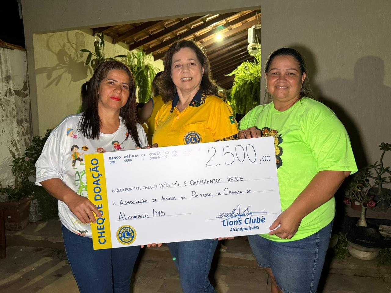 Parte da renda obtida foi direcionada à Pastoral da Criança de Alcinópolis. A presidente do Lions Clube, Sávia Christina, juntamente com os companheiros Leões, realizou a entrega do valor de R$ 2.500,00 (dois mil e quinhentos reais) à presidente da Associação dos Amigos da Pastoral da Criança, Rose de Assis Machado.