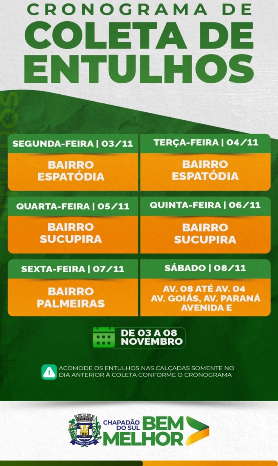Confira na imagem ao lado, e veja como o cronograma de recolhimento de entulho ficou definido: