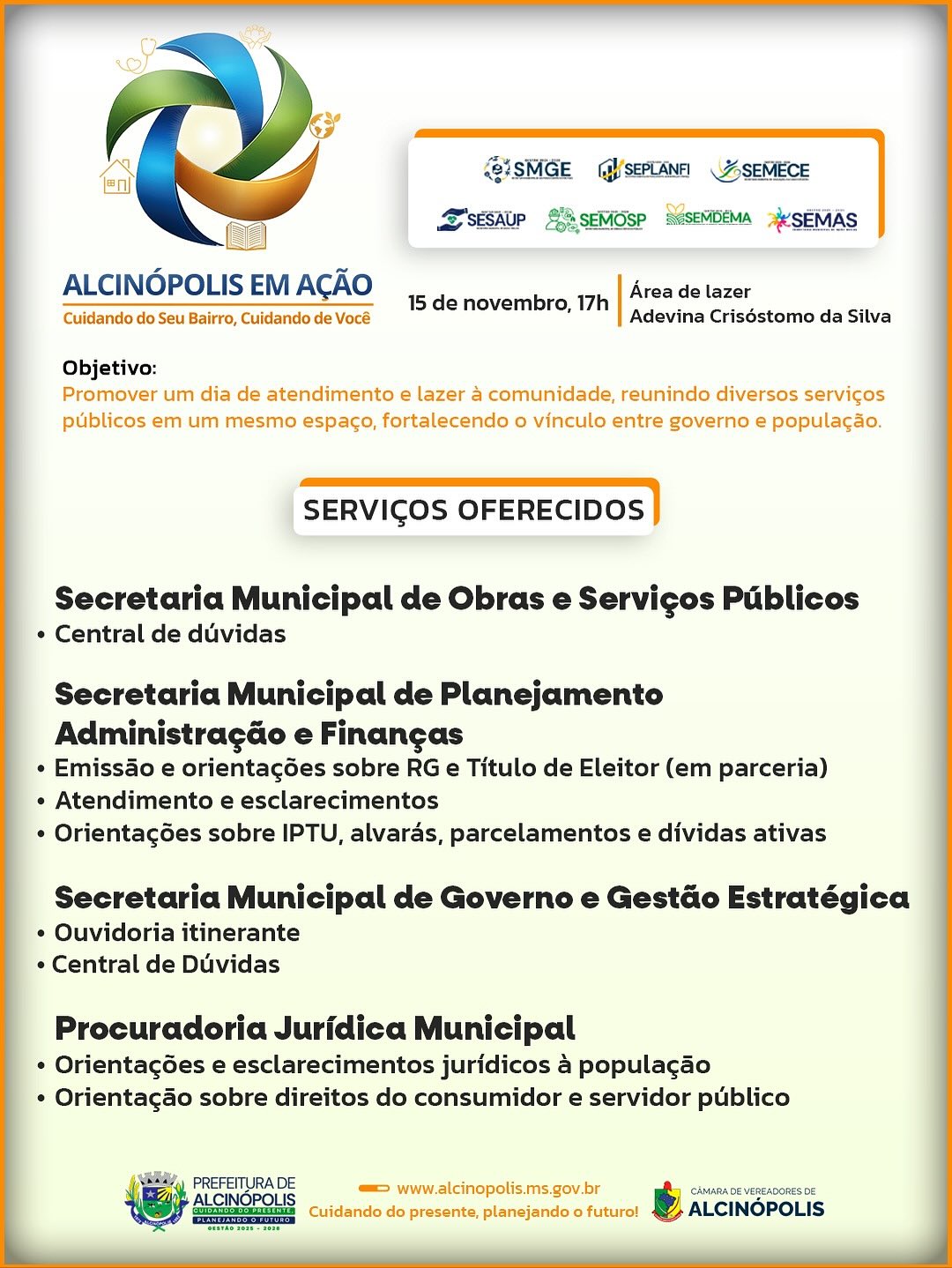 Com esse propósito, no próximo dia 15, todas as secretarias municipais estarão unidas na realização do programa “Alcinópolis em Ação – Cuidando do seu Bairro, Cuidando de Você”, que acontecerá na Área de Lazer Adelvina Crisóstomo da Silva.