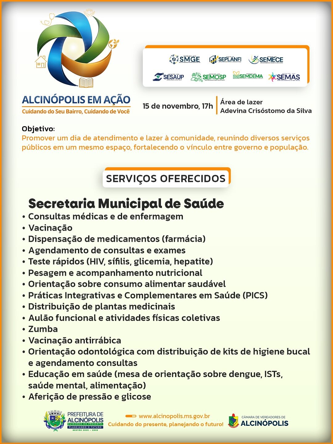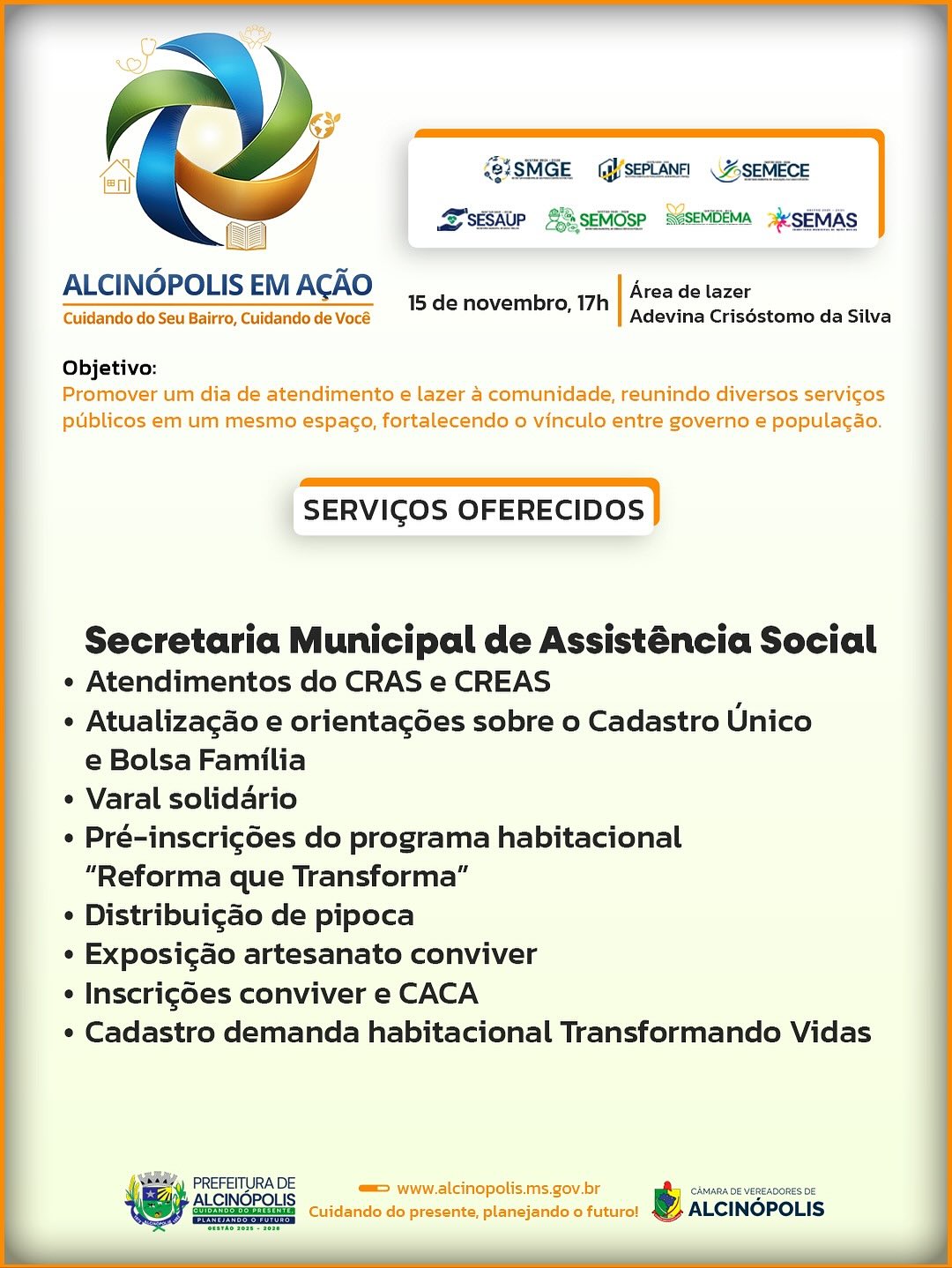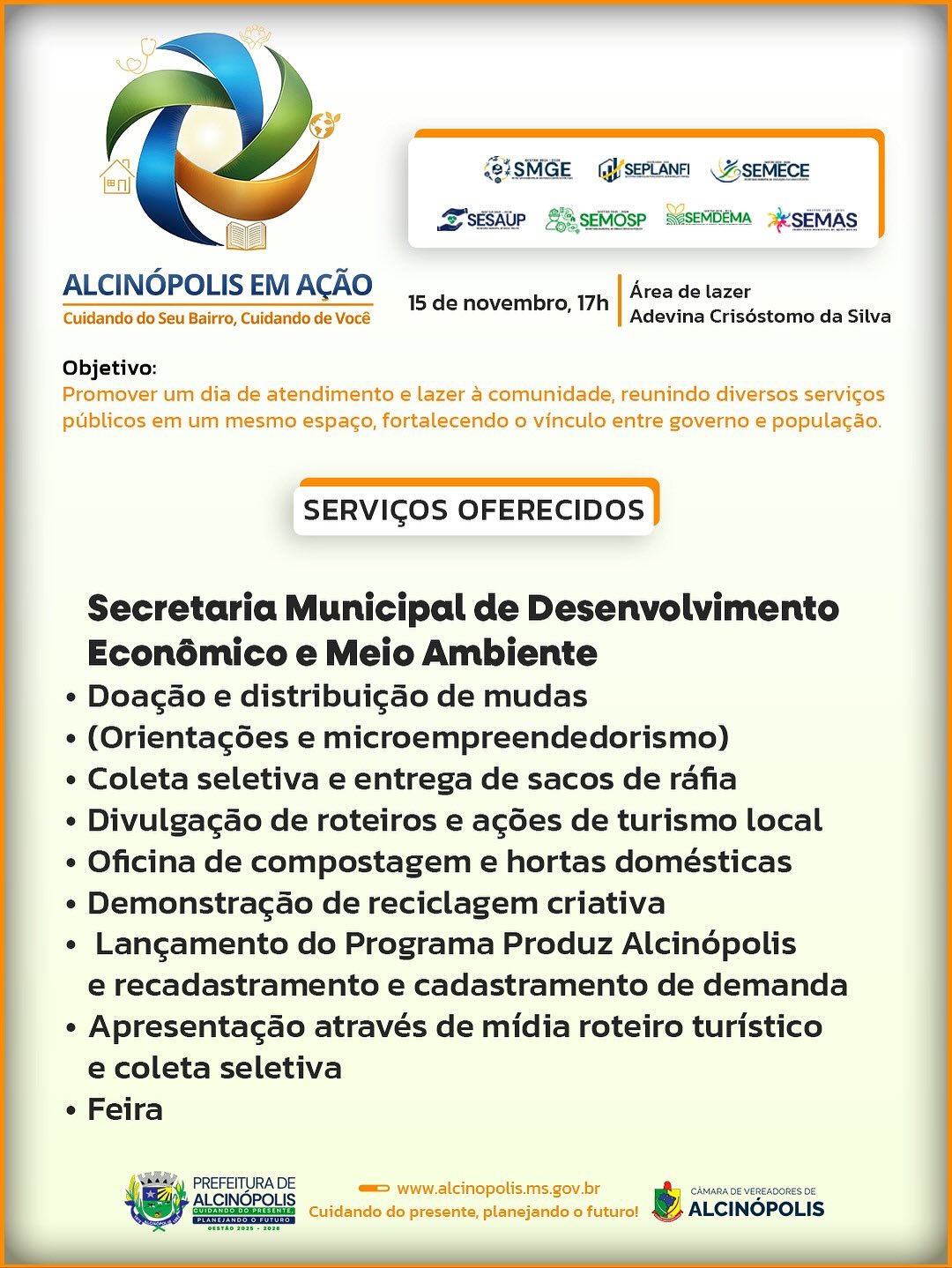 Com esse propósito, no próximo dia 15, todas as secretarias municipais estarão unidas na realização do programa “Alcinópolis em Ação – Cuidando do seu Bairro, Cuidando de Você”, que acontecerá na Área de Lazer Adelvina Crisóstomo da Silva.