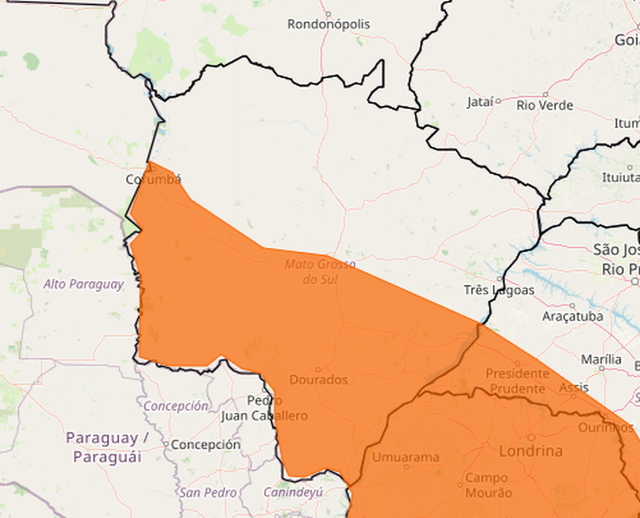 Previsão — O Inmet (Instituto Nacional de Meteorologia) emitiu um alerta de tempestade de grau de perigo para grande parte de Mato Grosso do Sul, válido entre 10h de sexta-feira (7) e 18h de sábado (8). O aviso indica chuvas intensas, com volumes entre 30 e 60 milímetros por hora ou 50 e 100 milímetros por dia, além de ventos fortes, que podem atingir 100 km/h, e possível queda de granizo.