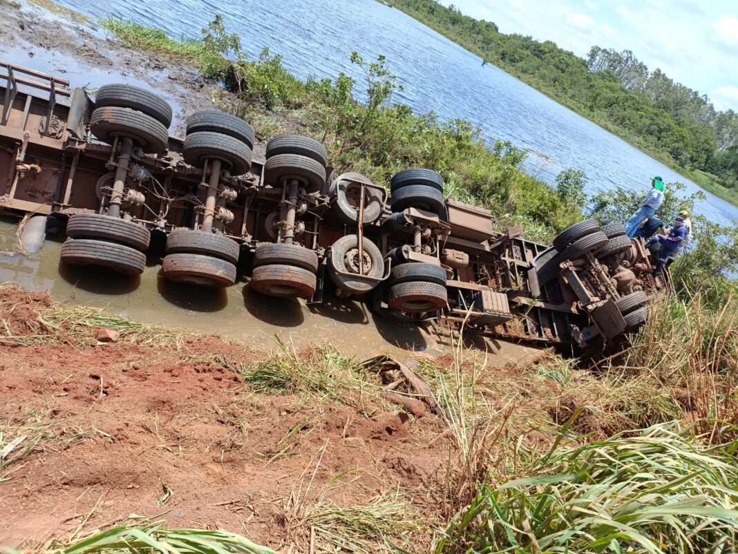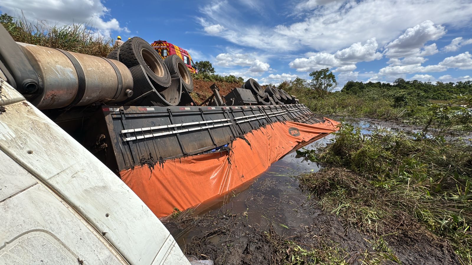Vídeos e fotos estão circulando nas redes sociais mostrando o tombamento de uma carreta, no Lago das Garças, na chegada de Chapadão do Céu.