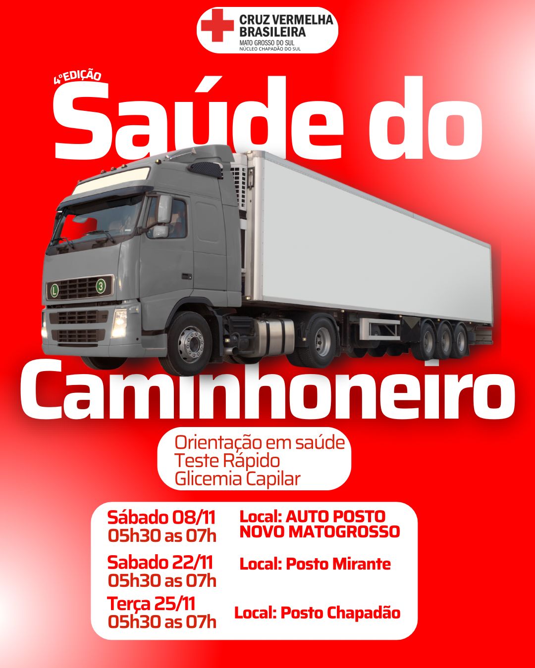 A Cruz Vermelha Brasileira (CVB) MS, por meio de seu Núcleo Municipal de Chapadão do Sul, deu início à organização da 4ª Edição da Campanha “Saúde do Caminhoneiro”. A iniciativa, voltada para a promoção da saúde e bem-estar de uma categoria essencial para o desenvolvimento nacional, terá três datas de atendimento em postos de combustível da cidade ao longo do mês de novembro.