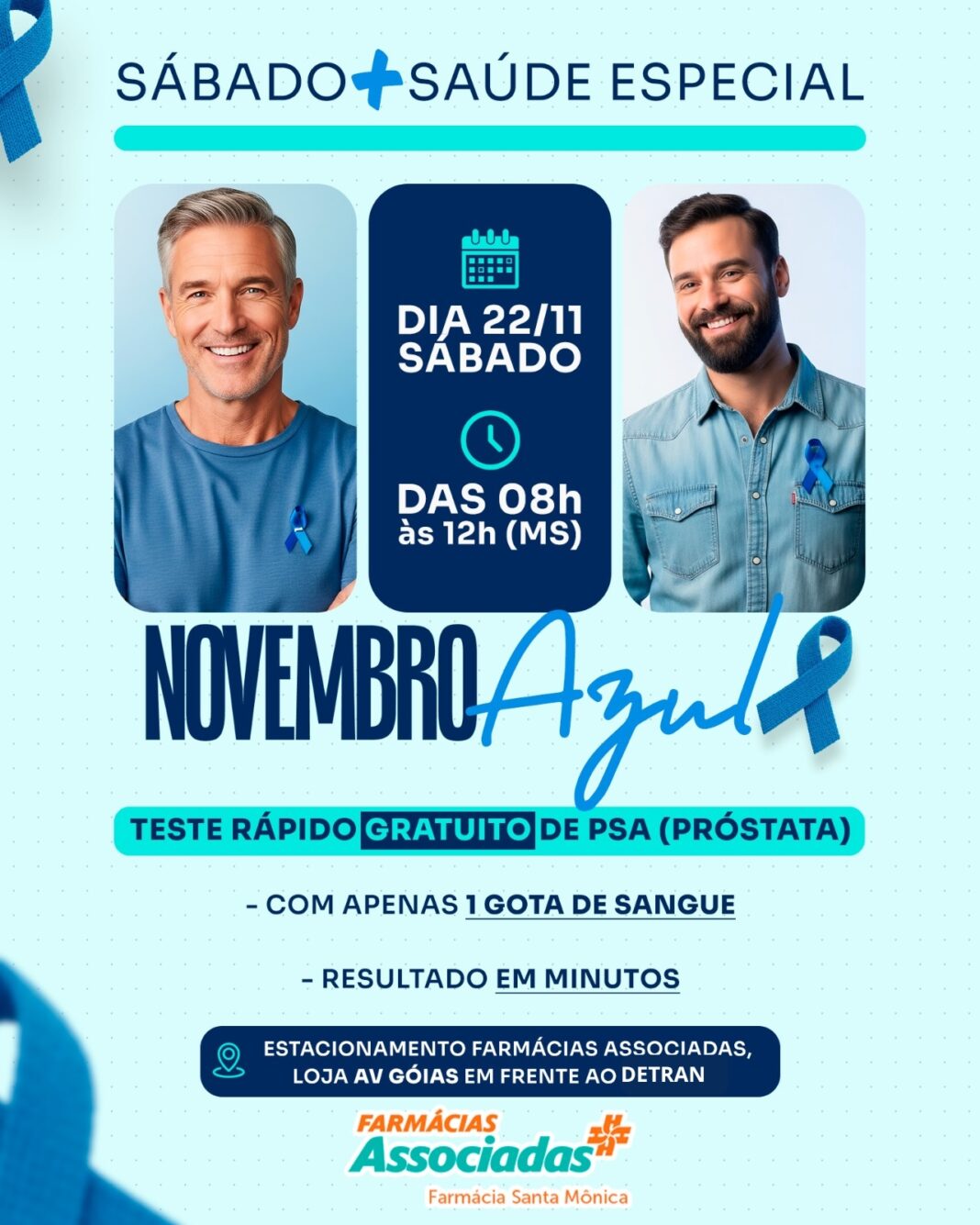 Neste Sábado dia 22/11, as Farmácias Associadas realizaram um Sábado +Saúde especial, focado na saúdo do Homem, com a realização do teste rápido de PSA (próstata) sem custo. O teste é feito com apenas uma gota de sangue, o resultado sai em minutos, e não será necessário agendamento para realização do teste rápido de PSA gratuito.