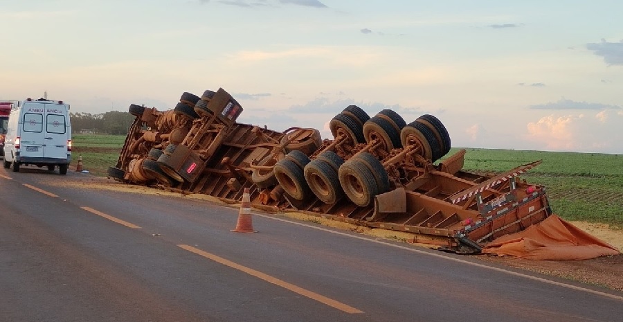 Por volta das 18h15min, a guarnição de resgate foi acionada para uma saída de pista seguida de tombamento de uma carreta de grãos, carregada de milho, em que, segundo o solicitante, a vítima apresentava ferimentos na cabeça e já estava fora do veículo.