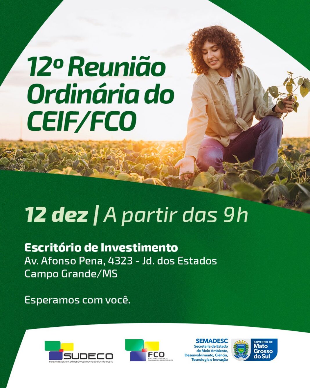 O Escritório de Investimentos do Sicredi, em Campo Grande, será o local da 12ª Reunião Ordinária do Conselho Estadual do FCO (CEIF/FCO), marcada para 12 de dezembro. O encontro reunirá representantes da Semadesc e das demais instituições que compõem o colegiado para analisar cartas-consulta de empresários e produtores rurais interessados em acessar recursos do Fundo Constitucional ainda em 2025.