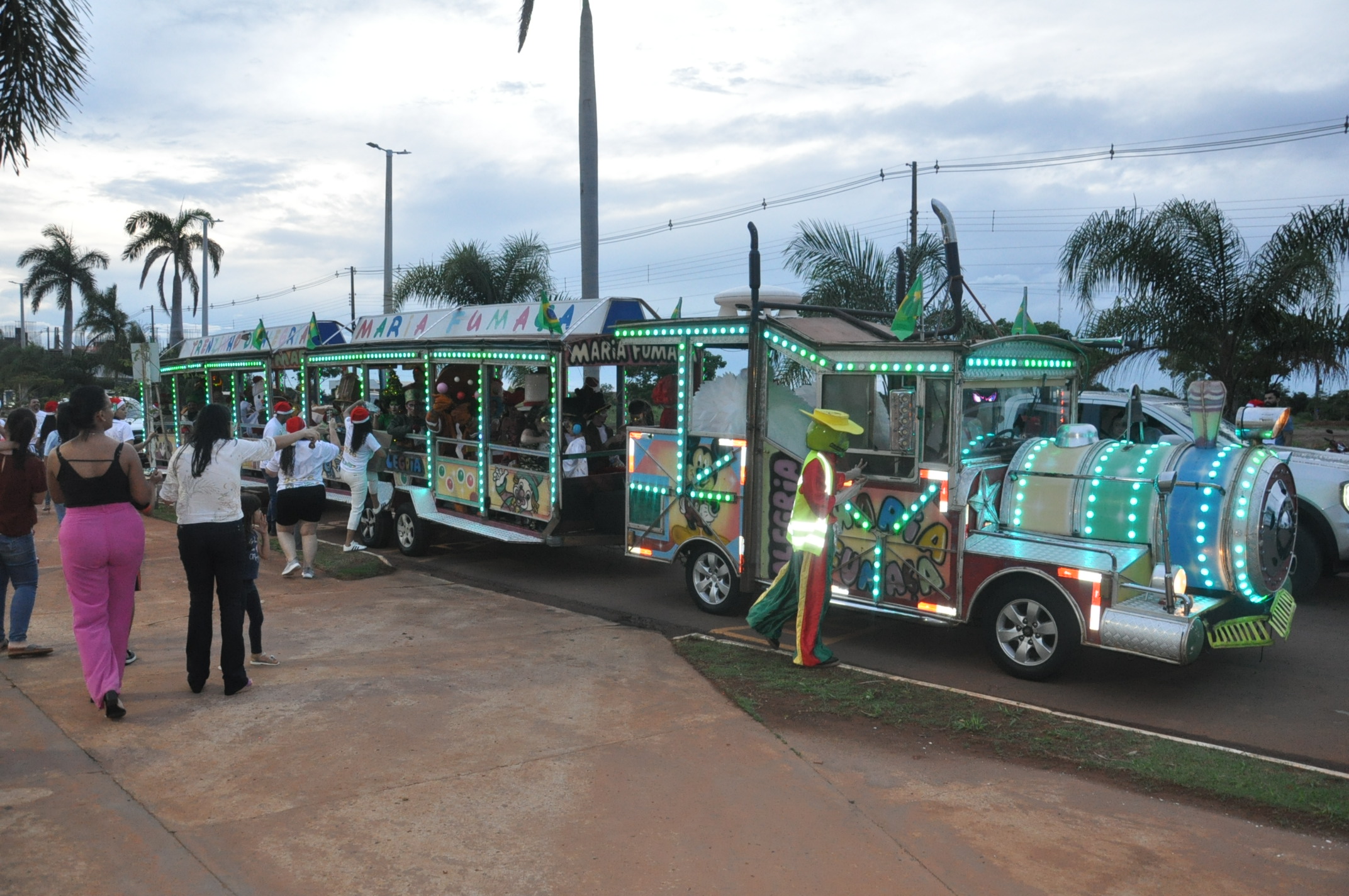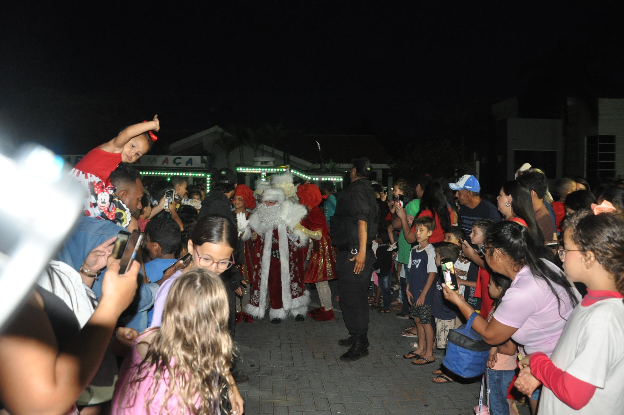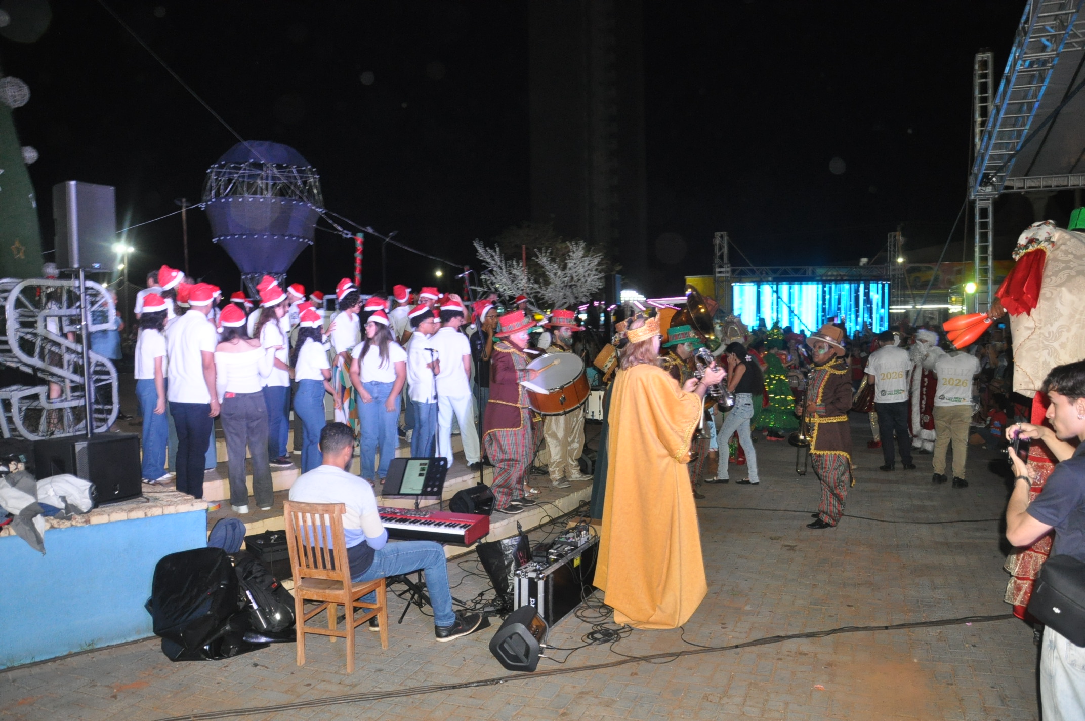 Na noite desta sexta-feira (12), a Praça de Eventos de Chapadão do Sul foi tomada por alegria, emoção e encantamento com a chegada do Papai Noel e da Mamãe Noel. O casal foi recepcionado pelo público em um animado trenzinho, acompanhado pela apresentação especial da Trupe do Reino, que levou diversão e o verdadeiro espírito natalino a crianças e adultos.