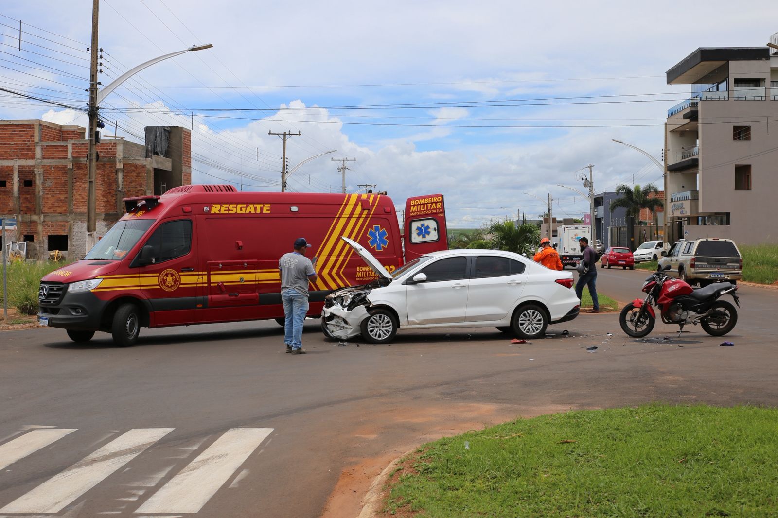 Conforme informações apuradas no local, o veículo Fiat Cronos trafegava pela Rua Sergipe e avançou a sinalização de parada obrigatória (PARE), sendo atingido pelo motociclista que seguia pela Avenida Mato Grosso do Sul (preferencial) no sentido centro/bairro.