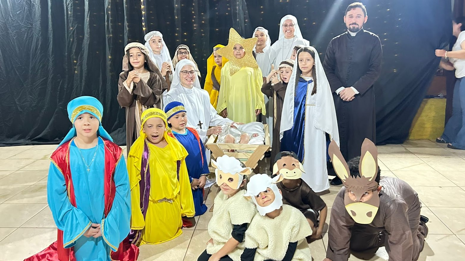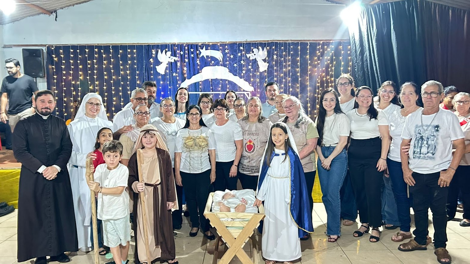 Enquanto isso, ao som da música “É Natal”, interpretada pelas irmãs, foi realizada a montagem do presépio, gesto que simboliza adoração, oração e meditação sobre o nascimento de Jesus. Cada figura colocada foi apresentada como um convite à reflexão sobre humildade, fé e entrega a Deus.