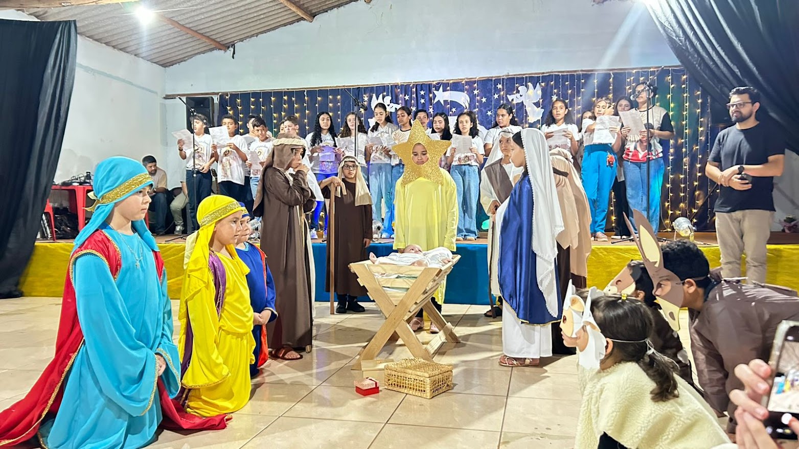 Um dos momentos mais aguardados da noite foi o teatro “A Estrelinha de Belém”, encenado pelas crianças da Infância e Adolescência Missionária (IAM). Com leveza e profundidade, a apresentação encantou o público e reforçou, de forma lúdica, o verdadeiro sentido do Natal.
