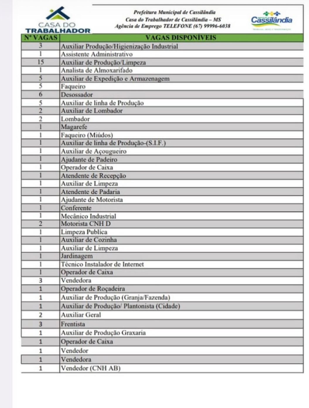 A Prefeitura Municipal de Cassilândia, por meio da Casa do Trabalhador, divulgou nesta semana uma nova relação de vagas de emprego disponíveis no município. As oportunidades contemplam diferentes áreas e níveis de escolaridade, ampliando as chances de inserção no mercado de trabalho para a população.