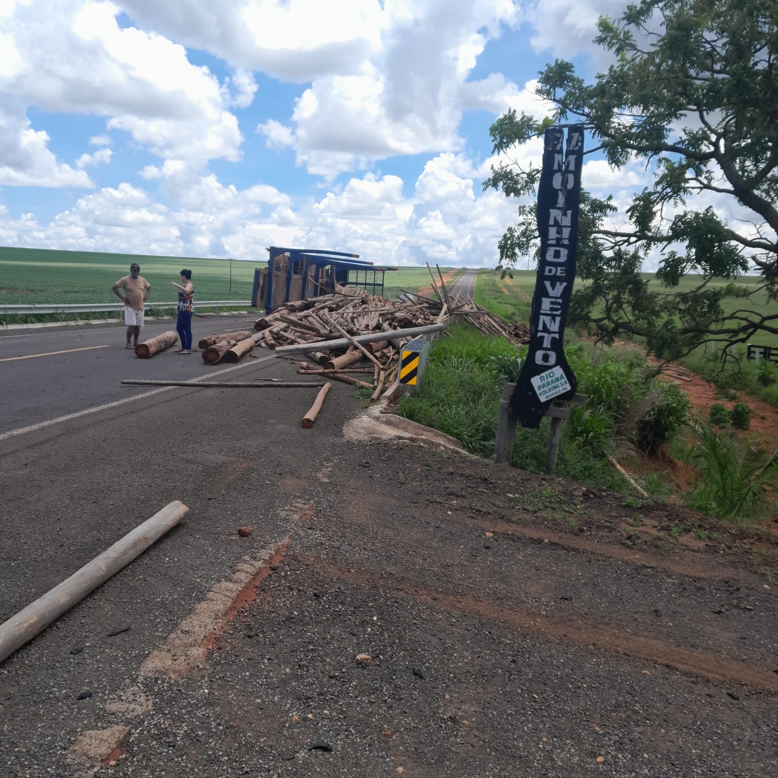 Uma carreta carregada de madeira de eucalipto, tombou na rodovia BR 060, entre Paraíso das Águas e Camapuã. Veículo seguia sentido Camapuã, quando tombou, na manhã deste sábado (10).
