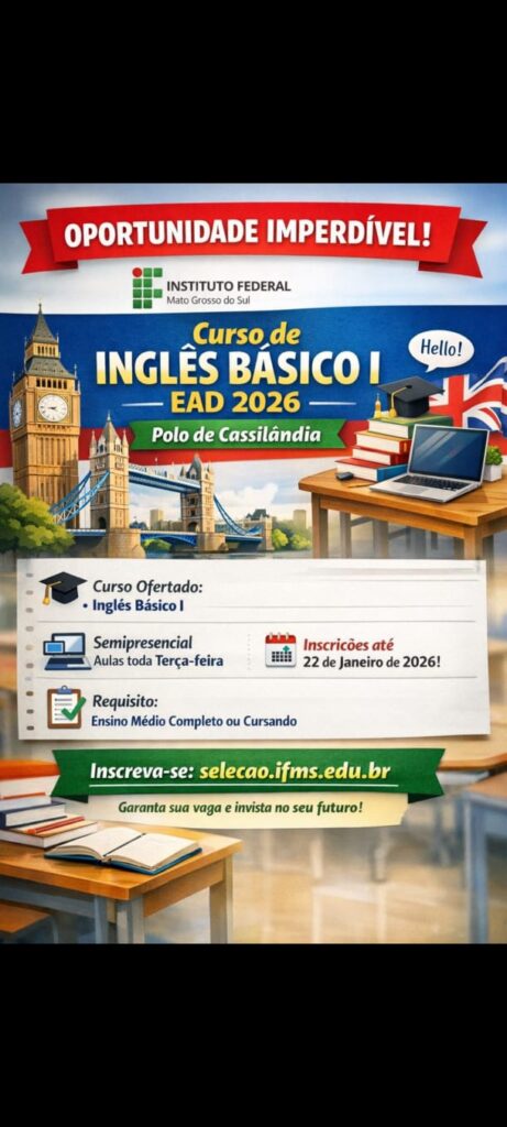 O Instituto Federal de Mato Grosso do Sul (IFMS) está com inscrições abertas para o curso Inglês Básico I – EAD 2026, com vagas destinadas ao Polo de Cassilândia. A iniciativa representa uma importante oportunidade de qualificação para a população que deseja aprimorar seus conhecimentos em língua inglesa e ampliar suas perspectivas acadêmicas e profissionais.