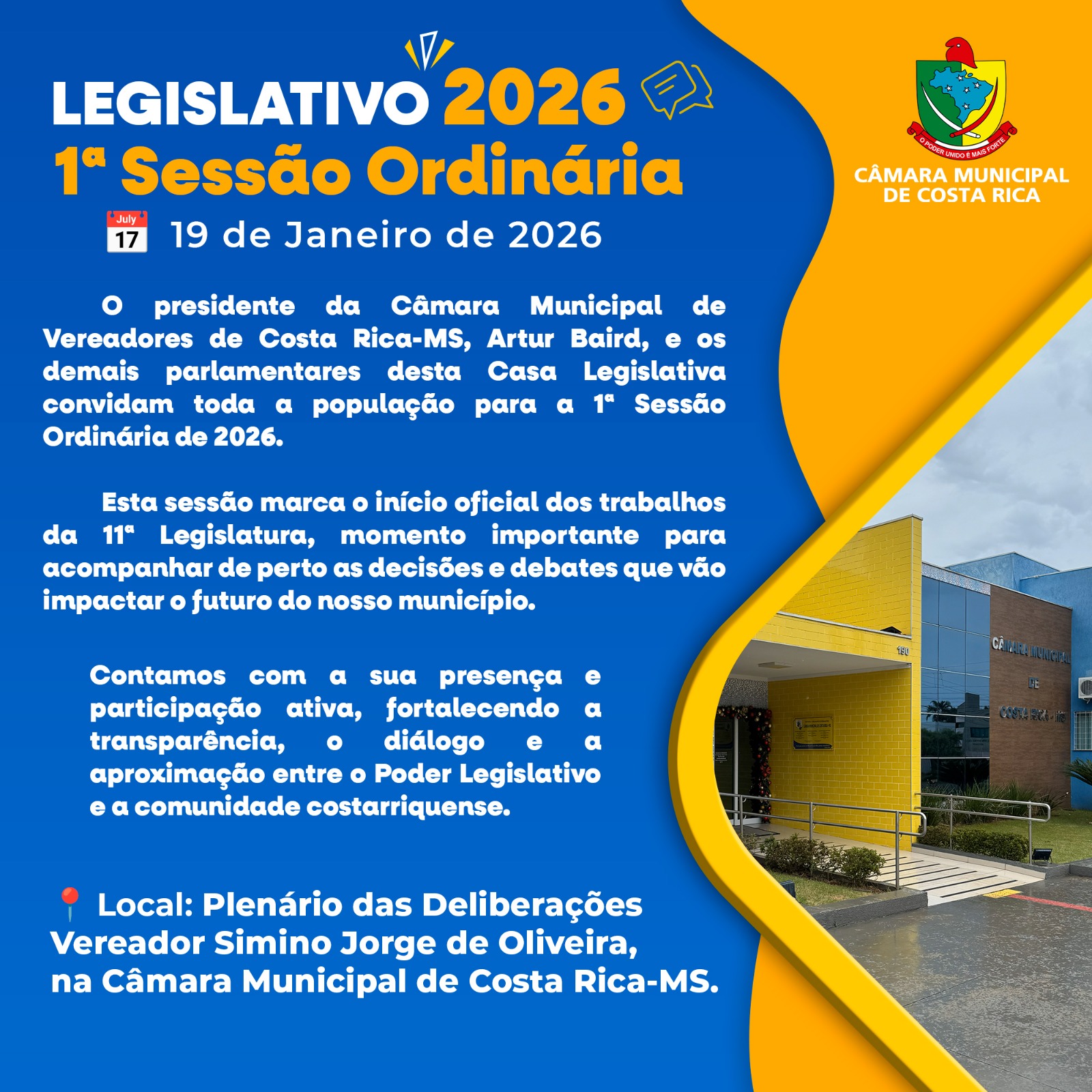 A Câmara Municipal de Costa Rica-MS convida você para a 1ª Sessão Ordinária de 2026, que marca o início oficial dos trabalhos da 11ª Legislatura.