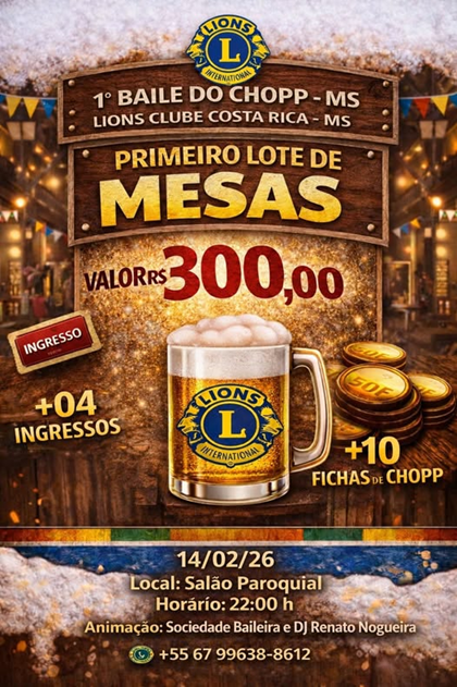 Já estão à venda as mesas para o tradicional Baile do Chopp de Costa Rica, promovido pelo Lions Clube Sucuriú.