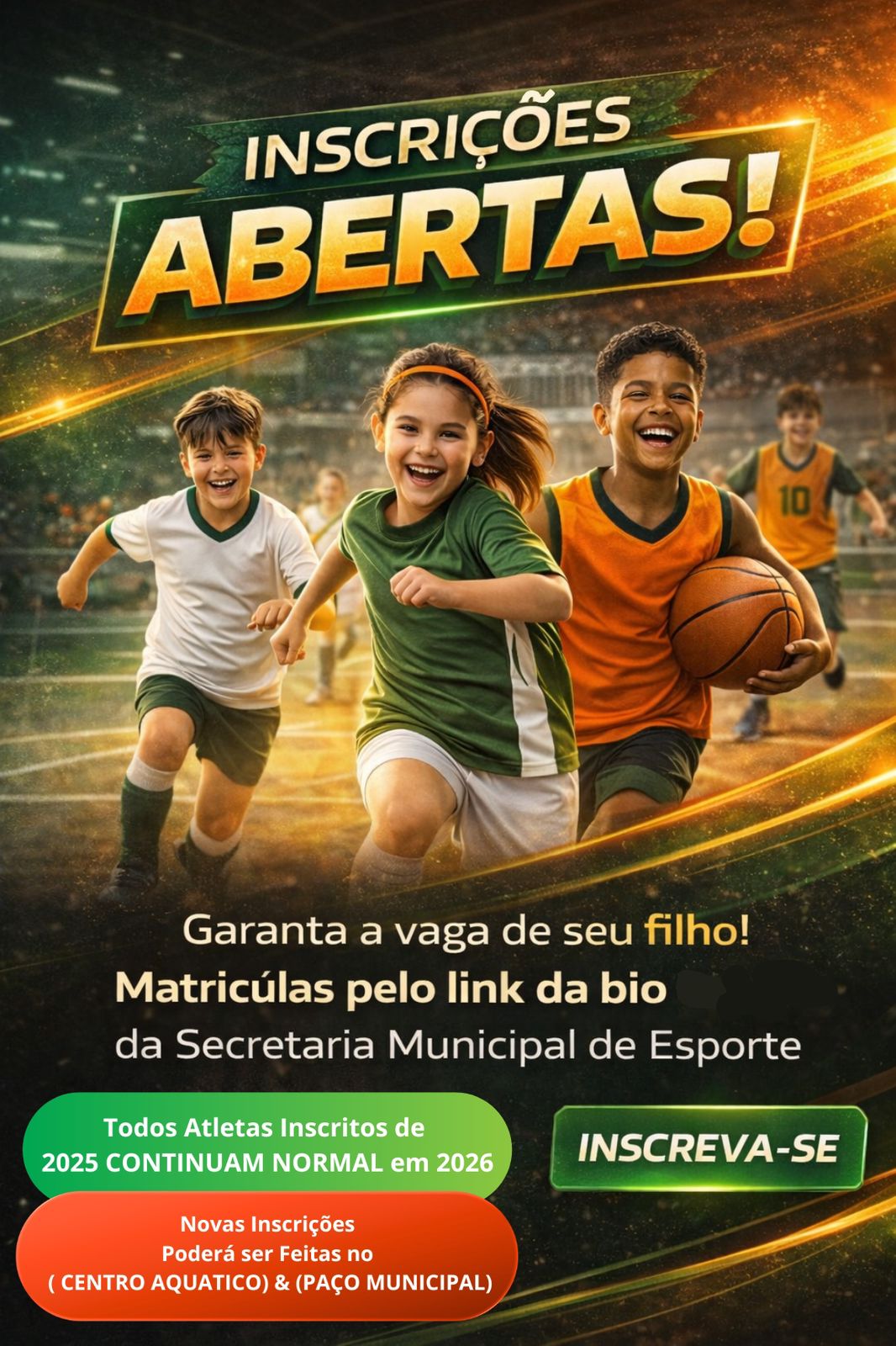 A Secretaria Municipal de Esporte de Chapadão do Sul informa que estão abertas as inscrições para as Escolinhas Esportivas 2026 ( MAIS PRECISA ATUALIZAR O CADASTRO NO SITE ) ampliando o acesso ao esporte, à saúde e à formação cidadã para crianças, jovens e adultos do município.