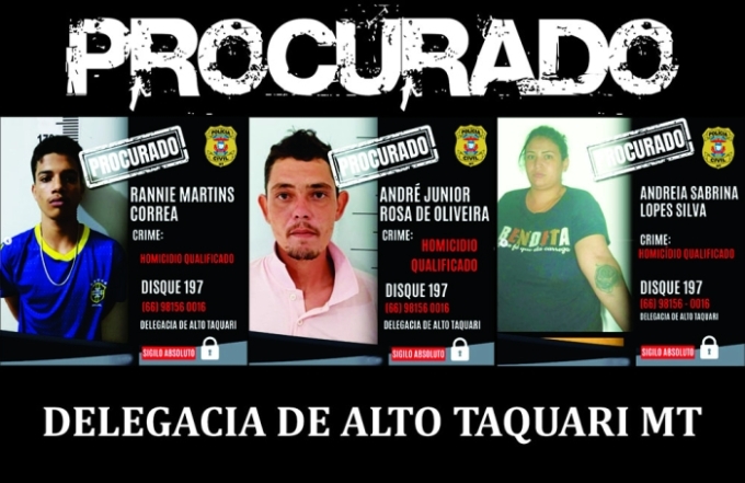 A Polícia Civil de Mato Grosso divulgou imagens de três pessoas consideradas procuradas pela Justiça, investigadas por envolvimento em homicídio qualificado, com atuação vinculada à Delegacia de Polícia de Alto Taquari MT.