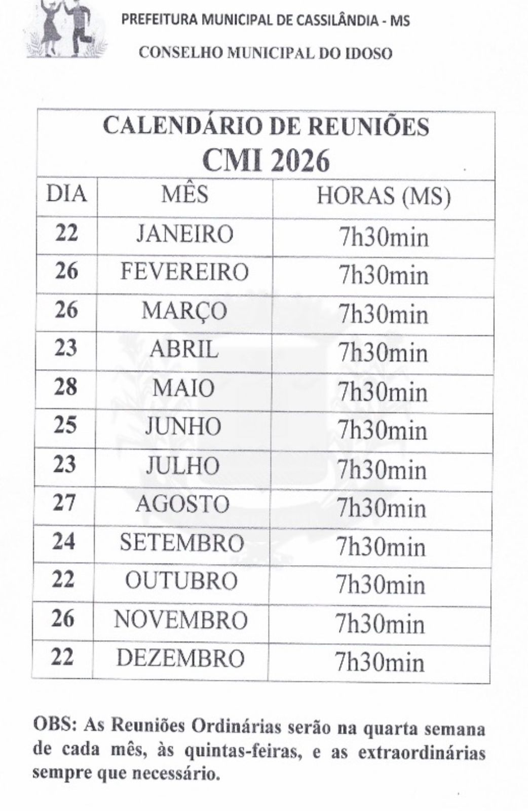 O Conselho Municipal do Idoso (CMI) de Cassilândia, regulamentado pela Lei Municipal Complementar nº 1.388, de 27 de fevereiro de 2004, aprovou oficialmente o calendário de reuniões ordinárias para o ano de 2026. A deliberação ocorreu durante reunião ordinária realizada no dia 22 de janeiro de 2026.