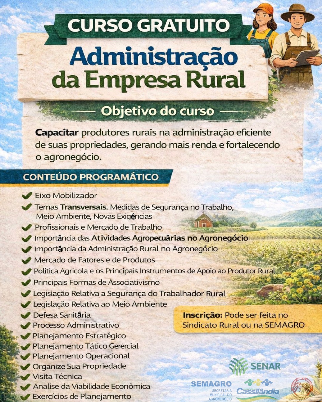 Produzir bem no campo nem sempre é garantia de lucro. Muitos produtores rurais enfrentam dificuldades para organizar custos, planejar investimentos e obter melhores resultados financeiros, mesmo trabalhando diariamente em suas propriedades. Pensando nessa realidade, a Secretaria Municipal do Agronegócio, em parceria com o SENAR e o Sindicato Rural, está oferecendo em Cassilândia o Curso de Administração da Empresa Rural.