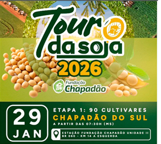 Nesta quinta-feira, 29 de janeiro, a partir das 07h30 (MS), inicia-se o Tour da Soja 2026 da Fundação Chapadão. Anualmente a Fundação Chapadão realiza este evento, que tem como finalidade apresentar resultados de experimentos e apresentação do comportamento de dezenas de cultivares recomendadas para cada microrregião.