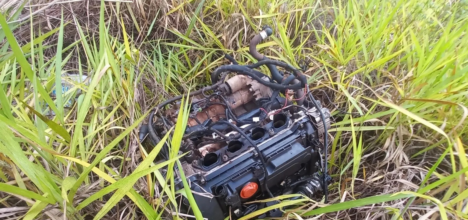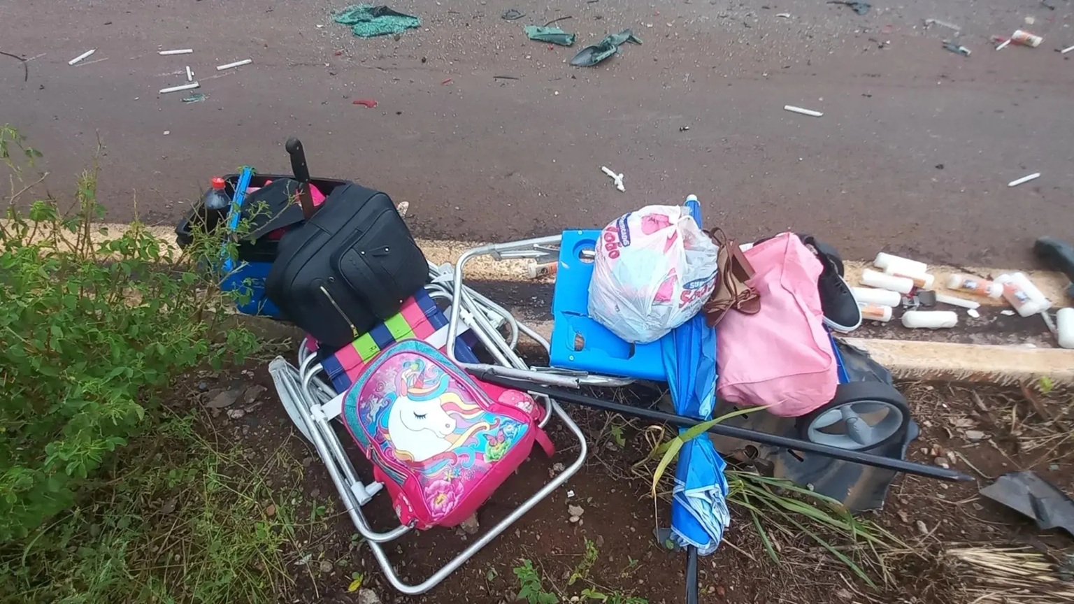 Devido ao impacto da colisão, os veículos ficaram completamente destruídos. Destroços se espalharam pela rodovia, bem como pertences pessoais, como mochila das crianças.