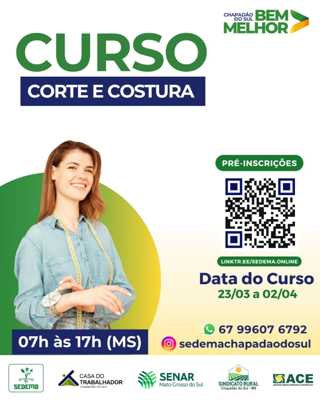 A Prefeitura de Chapadão do Sul, por meio da Secretaria de Desenvolvimento Econômico e Meio Ambiente (SEDEMA), em parceria com o SENAR/MS, Sindicato Rural, Casa do Trabalhador e Associação Comercial e Empresarial (ACE), está com inscrições abertas para o curso gratuito de Corte e Costura – Modelagem e confecção de peças.