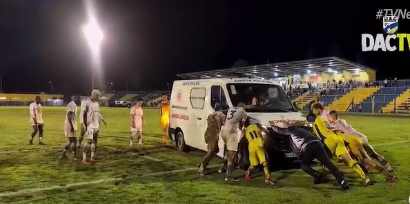 No entanto, enquanto deixava o gramado, a ambulância acabou atolando devido às más condições do campo, que estava encharcado em razão das fortes chuvas registradas na região nos últimos dias. Diante do imprevisto, jogadores das duas equipes se mobilizaram e ajudaram a empurrar o veículo para que ele pudesse sair do campo.