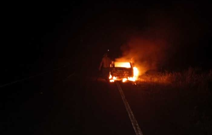 Veículo é destruído por incêndio às margens da BR-060, em Paraíso das Águas