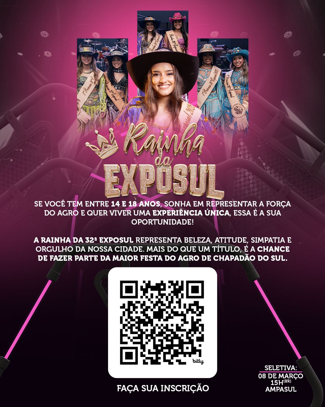 Além do anúncio da data do baile, também foi lançado o link oficial de inscrição para as candidatas que desejam concorrer ao título de Rainha da 32ª EXPOSUL. Podem participar meninas com idade entre 14 e 18 anos. As inscrições devem ser realizadas pelo link: