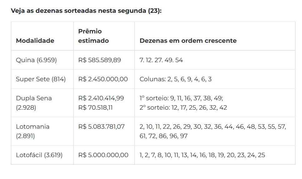 O sorteio, realizado no Espaço da Sorte, em São Paulo (SP), teve as dezenas: 1, 2, 7, 8, 10, 11, 13, 14, 16, 18, 19, 20, 23, 24 e 25. O prêmio principal, estimado em R$ 6,5 milhões, foi dividido igualmente entre cinco apostas vencedoras no Brasil