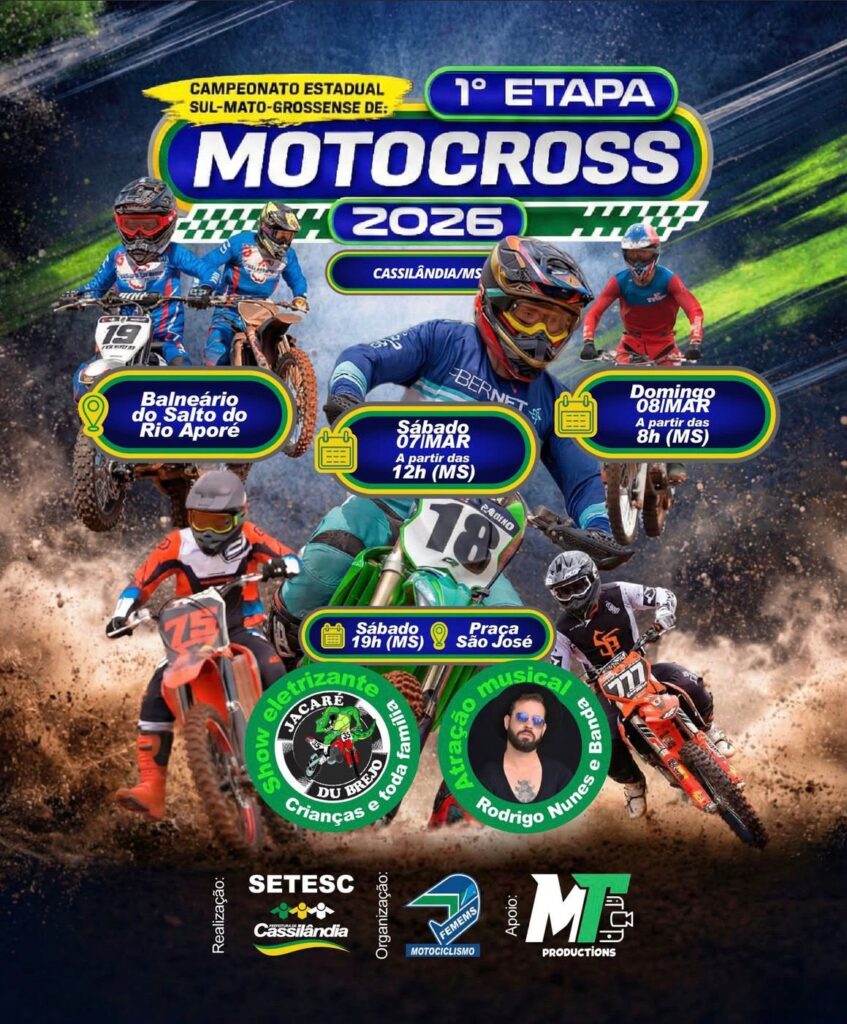 A iniciativa integra a programação paralela à etapa do Campeonato Estadual de Motocross, fortalecendo o esporte, o lazer e a cultura no município. A realização é do SETESC e da Prefeitura Municipal de Cassilândia, com organização da FEMEMS.