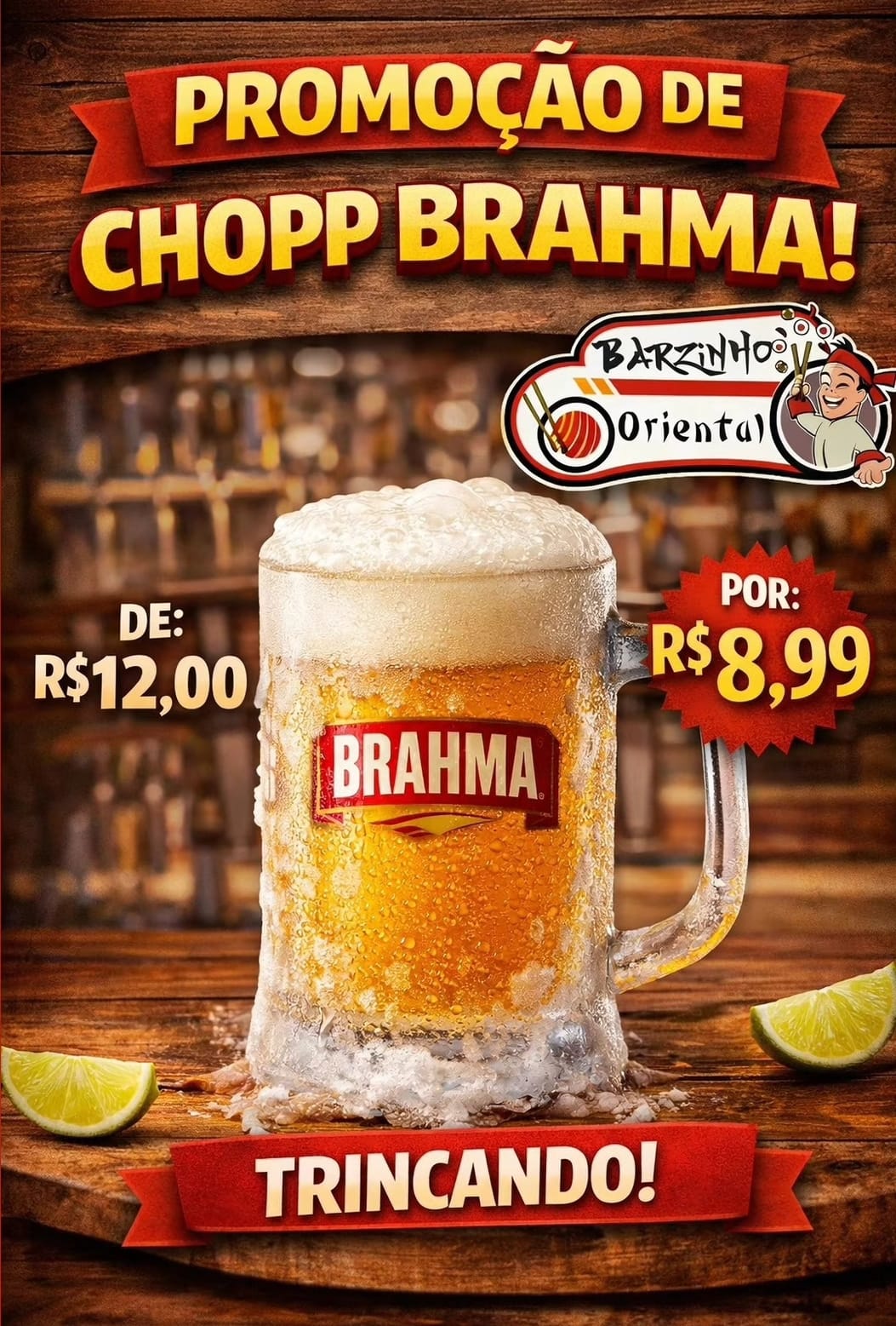 O Barzinho Oriental tem Happy Hour com promoção no Chopp Brahma todos os dias, a caneca de Chopp de R$ 12,00 saí por somente R$ 8,99 das 17h às 20 horas (horário de Brasília).