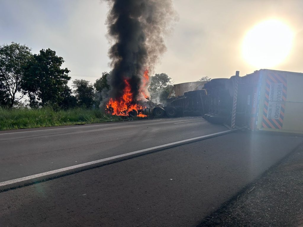 Acidente envolvendo duas carretas interditou totalmente a BR-262 na manhã desta sexta-feira (13), no trecho entre os municípios de Água Clara e Ribas do Rio Pardo. Os veículos colidiram frontalmente e um deles pegou fogo.