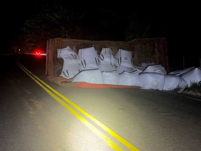 Com o acidente, parte da carga de adubo ficou espalhada sobre a pista, exigindo atenção redobrada dos motoristas que trafegavam pelo local. Apesar do susto, o condutor do veículo não sofreu ferimentos.