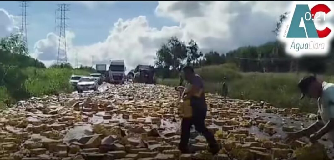 Segundo informações do AC Água Clara, o motorista perdeu o controle do veículo e provocou o acidente. Com o impacto, toda a carga foi lançada sobre a pista, espalhando caixas pela rodovia.