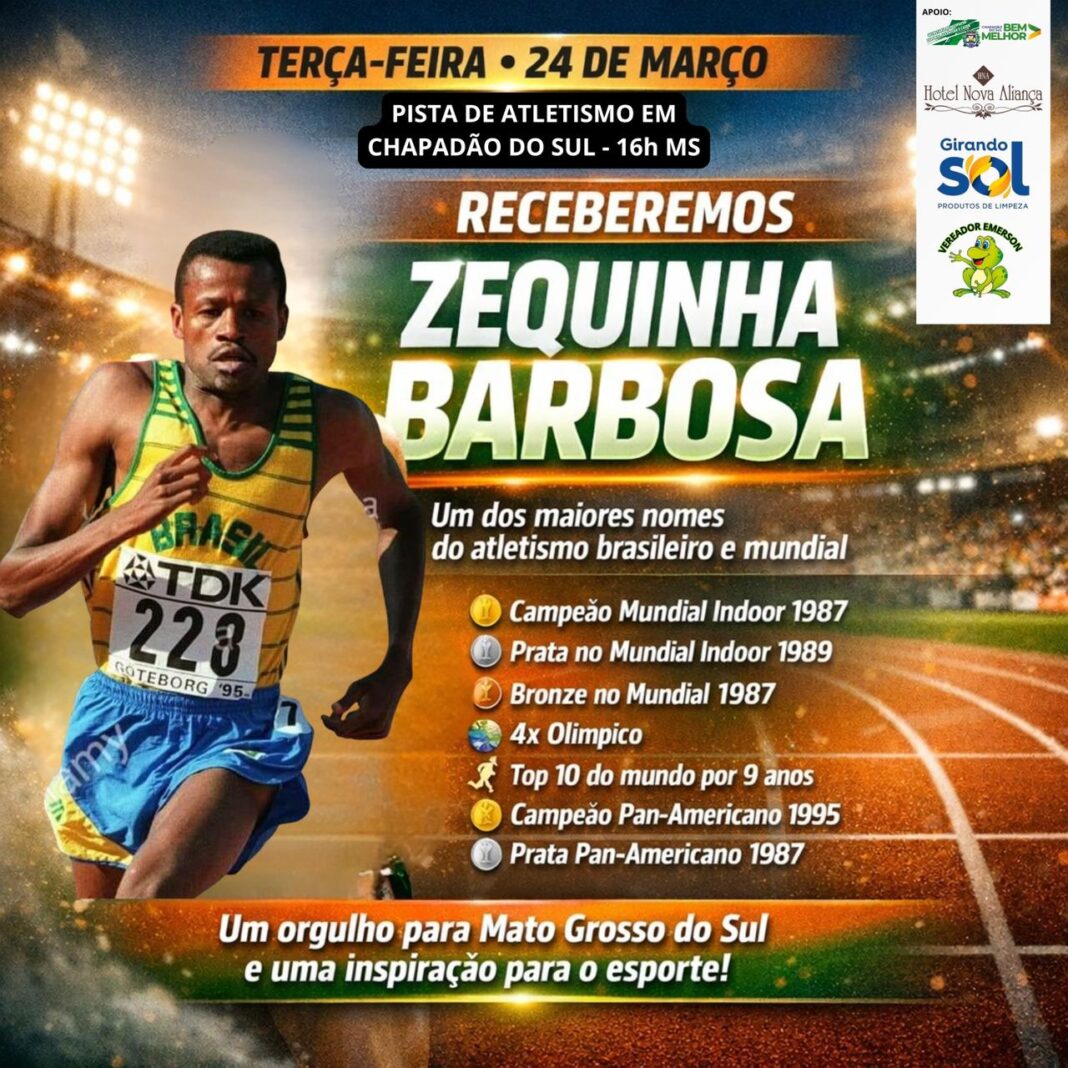 Chapadão do Sul será palco de um momento especial para o esporte. Na próxima terça-feira, 24 de março, às 16h (horário de MS), a pista de atletismo do município receberá a visita do renomado atleta Zequinha Barbosa, referência nacional e internacional na modalidade.