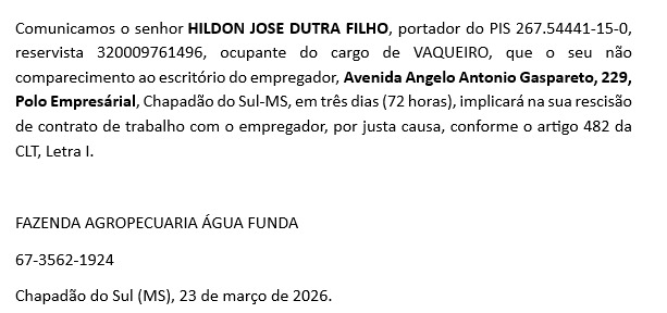 InícioChapadão do SulAbandono de Emprego Abandono de Emprego 23 de março de 2026 34 FacebookTwitterPinterestWhatsApp Adejair Artigo anteriorEducação sul-chapadense recebe Selo Nacional Compromisso com a Alfabetização MEC 2026 em BrasíliaPróximo artigoIdoso de 82 anos morreu atropelado em Alcinópolis Prefeitura de Cassilândia realizou mutirão de cirurgias de varizes na Santa Casa 23 de março de 2026 Nota de Pesar da Prefeitura de Cassilândia 23 de março de 2026 Idoso de 82 anos morreu atropelado em Alcinópolis 23 de março de 2026 Educação sul-chapadense recebe Selo Nacional Compromisso com a Alfabetização MEC 2026 em Brasília 23 de março de 2026 Prefeitura de Cassilândia realizou mutirão de cirurgias de varizes na Santa Casa Nota de Pesar da Prefeitura de Cassilândia Idoso de 82 anos morreu atropelado em Alcinópolis Educação sul-chapadense recebe Selo Nacional Compromisso com a Alfabetização MEC 2026 em Brasília Presidente e diretor da Fundação Chapadão participaram da posse da nova direção da Embrapa Carreta carregada com soja tomba na BR 060 entre Paraíso das Águas e Chapadão do Sul Município de Figueirão conquista o Selo Ouro em alfabetização Mais de 41 vagas: Prefeitura abre inscrições para Processo Seletivo da Secretaria de Obras Operação policial resgata crianças vivendo em meio a lixo e animais mortos em Chapadão do Céu-GO Paraíso das Águas conquista Selo Ouro do MEC por excelência na alfabetização Vereador Bannak renunciou cargo de 1º secretário da Câmara de Vereadores. Gestante fica ferida após queda de motocicleta causada por fio solto em Chapadão do Sul