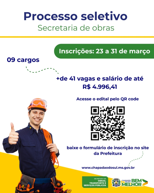 A Prefeitura de Chapadão do Sul informa a abertura de Processo Seletivo Simplificado para o provimento de cargos e formação de cadastro de reserva de profissionais que atuarão junto à Secretaria Municipal de Obras, Transportes e Serviços Públicos.