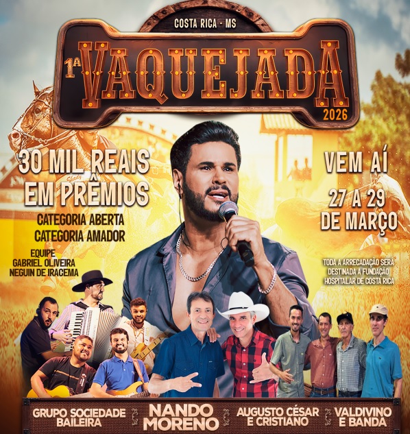 Uma das atrações confirmadas da 1ª Vaquejada de Mato Grosso do Sul, o cantor Nando Moreno gravou um convite especial ao público de Costa Rica e região. Em mensagem direcionada aos fãs, o artista anunciou que sobe ao palco no dia 28 de março de 2026, destacando que prepara um “super show” para o evento. Nando reforçou o convite para que a população participe da festa e afirmou que está chegando para celebrar junto com o público essa edição histórica da vaquejada no Estado.