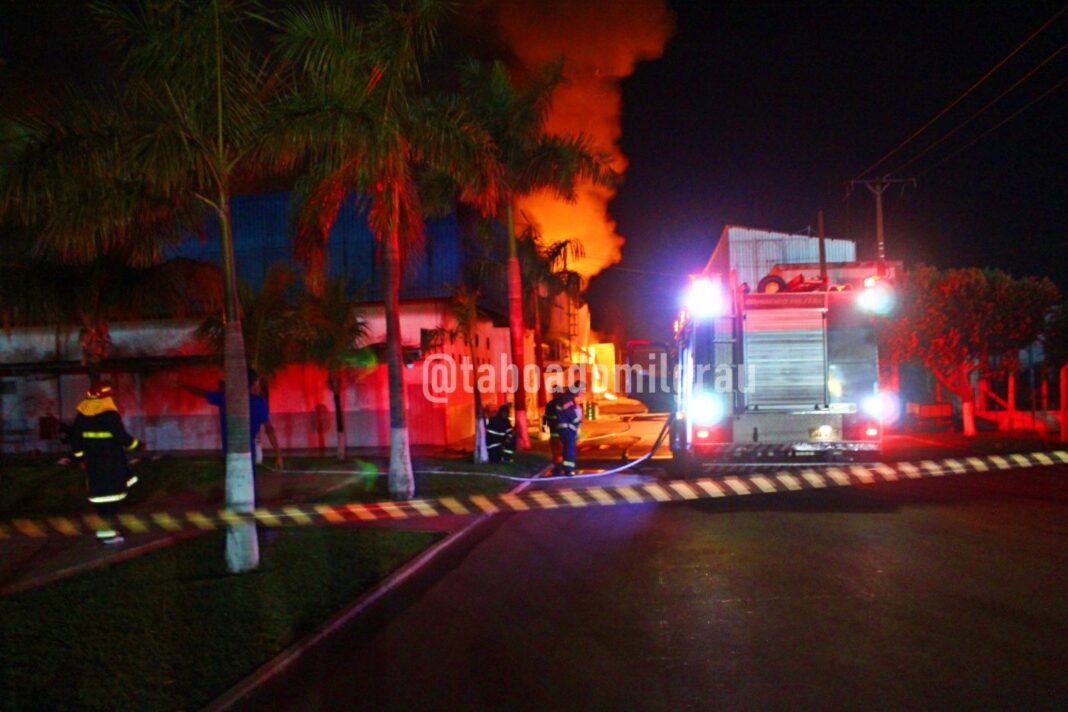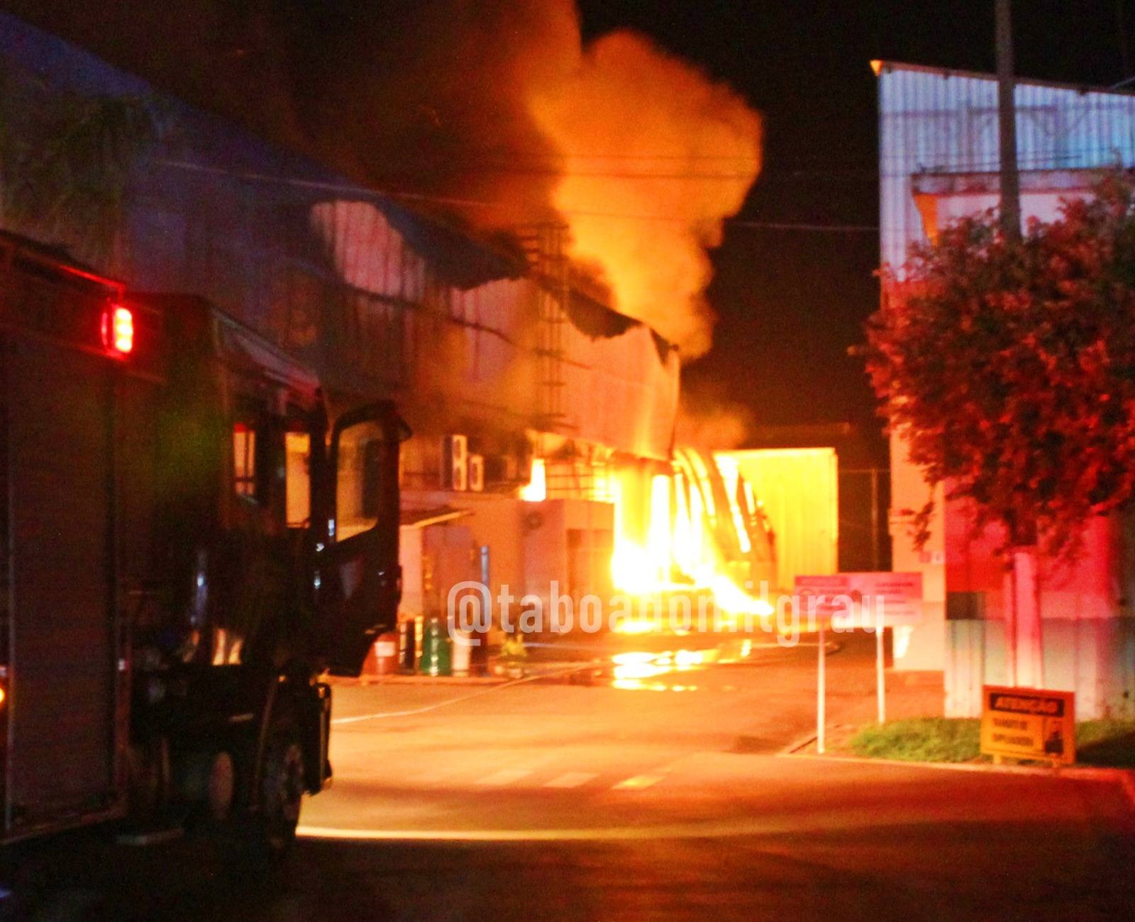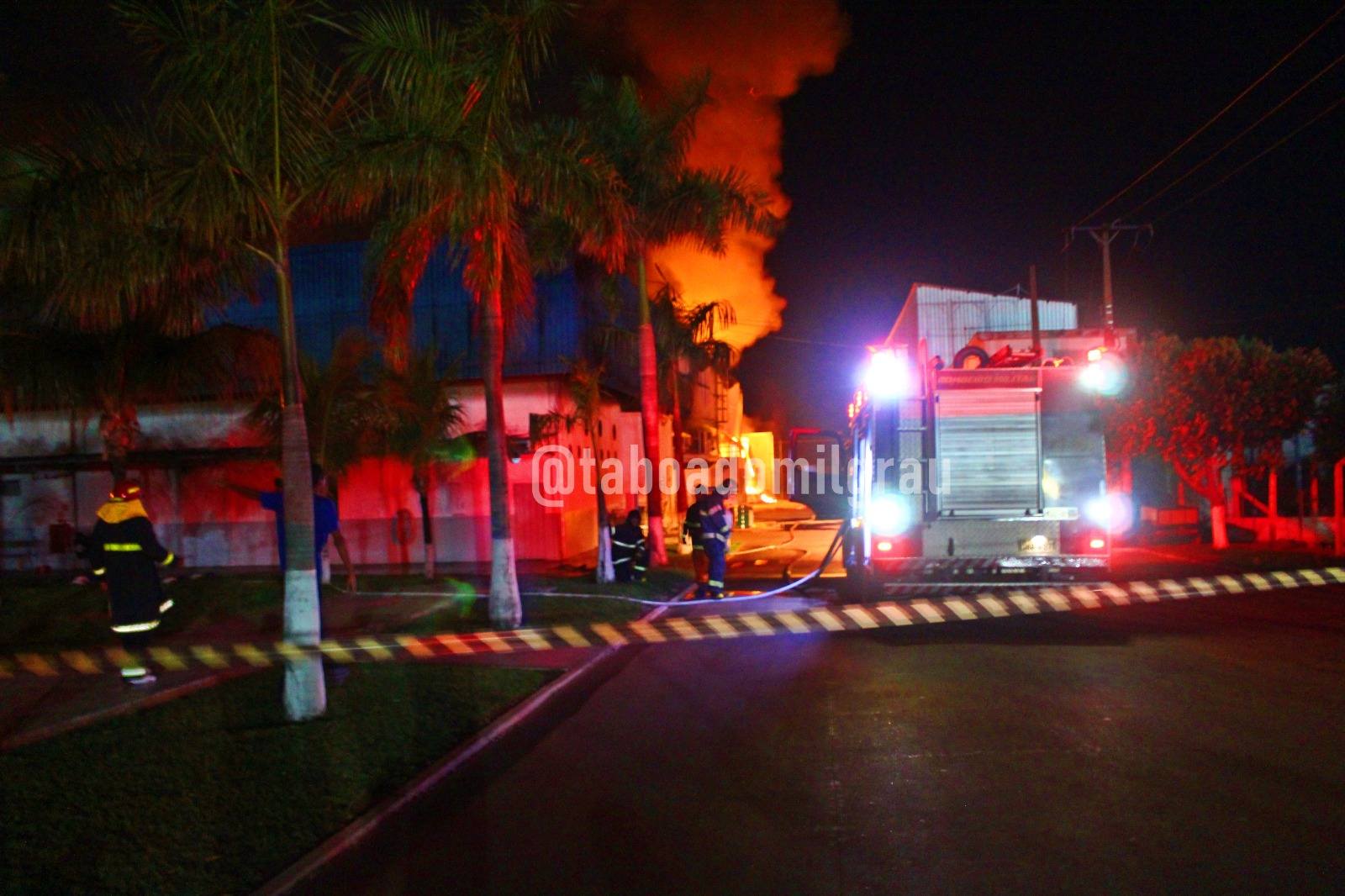 Neste momento, equipes do Corpo de Bombeiros atuam, há mais de 07 horas no combate às chamas que atingem a empresa Pais e Filhos, na cidade de Aparecida do Taboado.