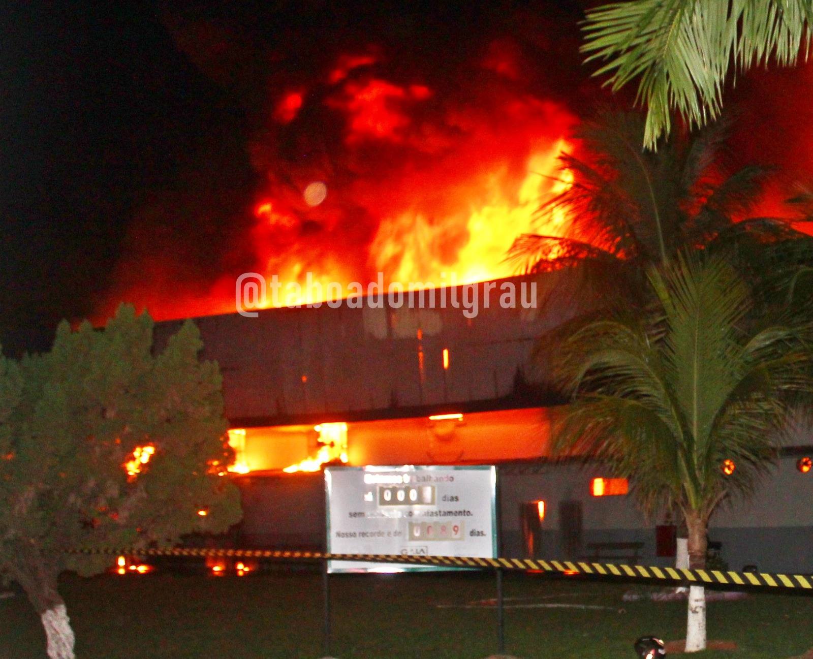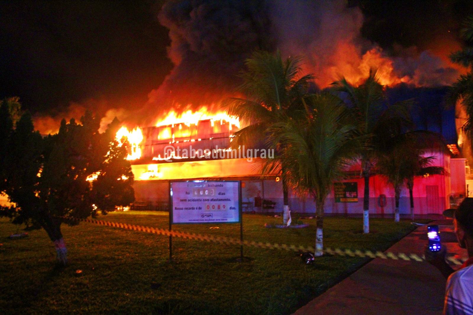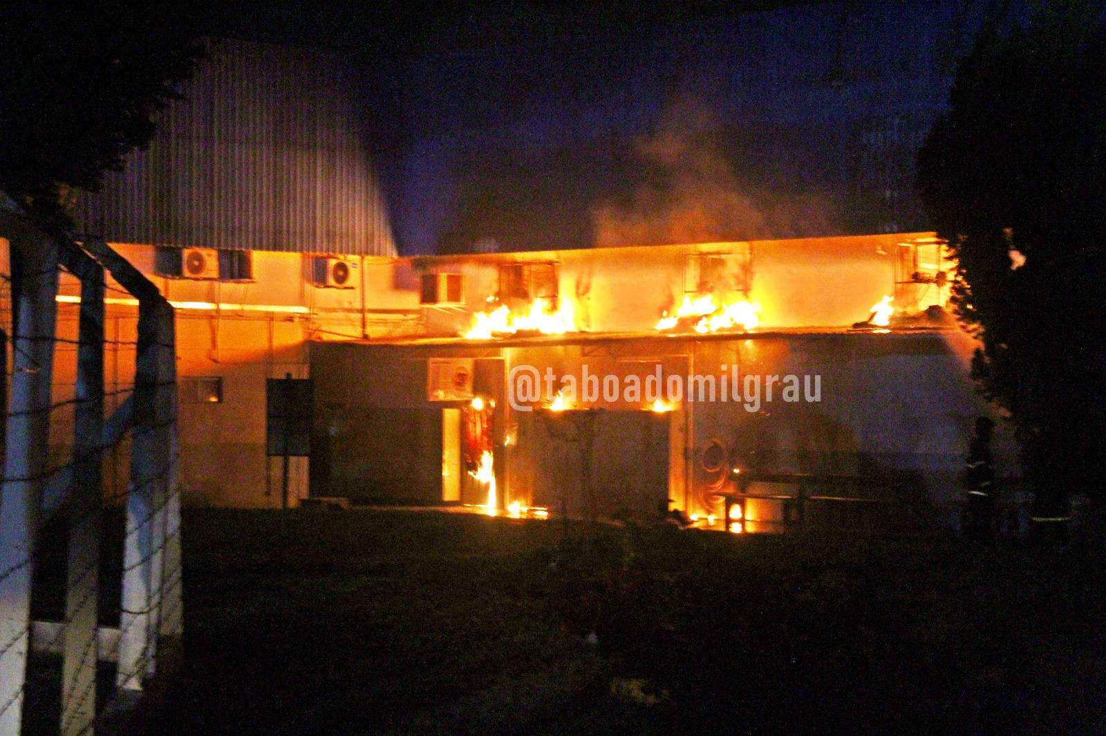 Neste momento, equipes do Corpo de Bombeiros atuam, há mais de 07 horas no combate às chamas que atingem a empresa Pais e Filhos, na cidade de Aparecida do Taboado.